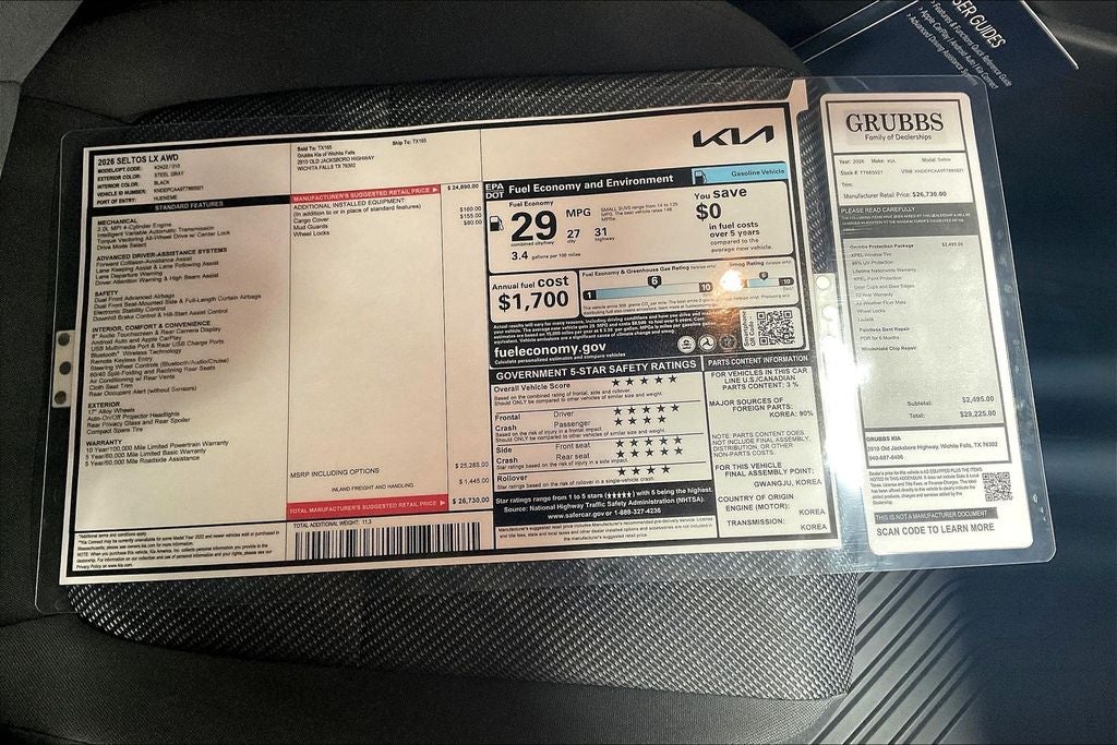 New Price! 2026 Kia Seltos LX 4D Sport Utility LX Steel Gray AWD CVT 2.0L I4 MPI Seltos LX, 4D Sport Utility, 2.0L I4 MPI, CVT, AWD, Steel Gray, Black Cloth, 4-Wheel Disc Brakes, 6 Speakers, ABS brakes, Air Conditioning, Alloy wheels, AM/FM radio, Apple CarPlay & Android Auto, Brake assist, Cloth Seat Trim, Delay-off headlights, Driver door bin, Driver vanity mirror, Dual front impact airbags, Dual front side impact airbags, Electronic Stability Control, Exterior Parking Camera Rear, Four wheel independent suspension, Front anti-roll bar, Front Bucket Seats, Front Center Armrest, Front reading lights, Low tire pressure warning, Overhead airbag, Power door mirrors, Power steering, Power windows, Radio: AM/FM Display Audio System, Rear window defroster, Remote keyless entry, Speed-sensing steering, Split folding rear seat, Spoiler, Steering wheel mounted audio controls, Tachometer, Telescoping steering wheel, Tilt steering wheel, Traction control, Wheel Locks.