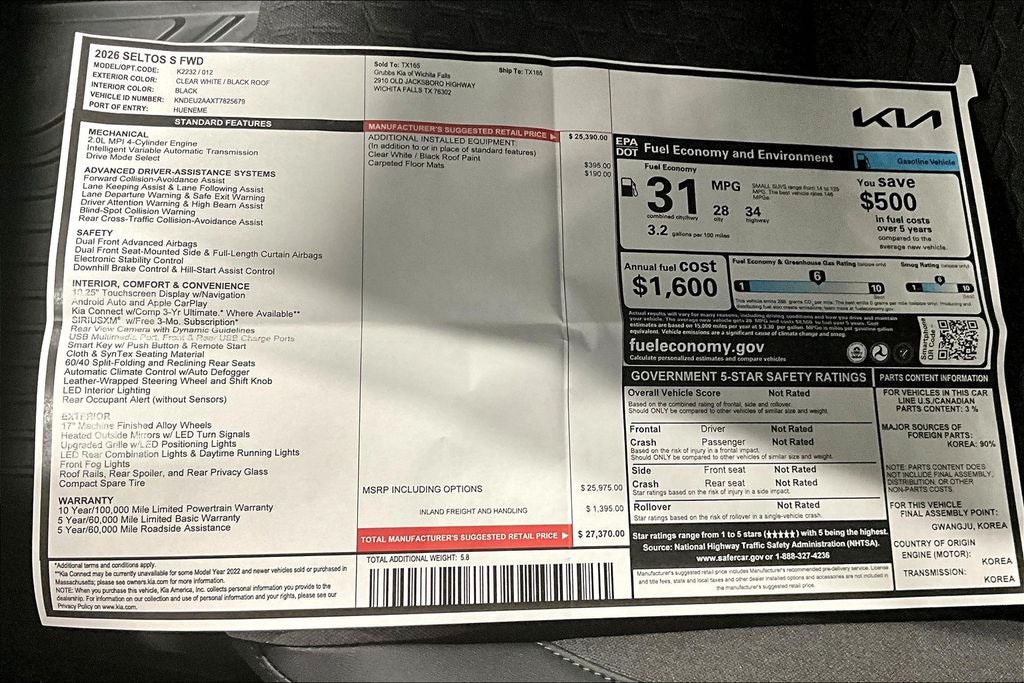 2026 Kia Seltos S 4D Sport Utility S Clear White/Black Roof FWD CVT 2.0L I4 MPI Seltos S, 4D Sport Utility, 2.0L I4 MPI, CVT, FWD, Clear White/Black Roof, Black Cloth, 6 Speakers, ABS brakes, Air Conditioning, Alloy wheels, AM/FM radio: SiriusXM, Apple CarPlay & Android Auto, Automatic temperature control, Brake assist, Carpet Floor Mats, Cloth & Artificial Leather Seat Trim, Driver door bin, Driver vanity mirror, Electronic Stability Control, Exterior Parking Camera Rear, Front Bucket Seats, Front Center Armrest, Fully automatic headlights, Glossy Black Door Garnish, Glossy Black Door Garnish Package, Illuminated entry, Leather Shift Knob, Navigation System, Outside temperature display, Overhead console, Panic alarm, Passenger door bin, Power door mirrors, Power steering, Power windows, Radio: AM/FM/HD/Satellite Display System w/Navigation, Rear seat center armrest, Rear window defroster, Rear window wiper, Remote keyless entry, Security system, Speed control, Speed-sensing steering, Split folding rear seat, Spoiler, Steering wheel mounted audio controls, Tilt steering wheel, Traction control, Turn signal indicator mirrors, Variably intermittent wipers.