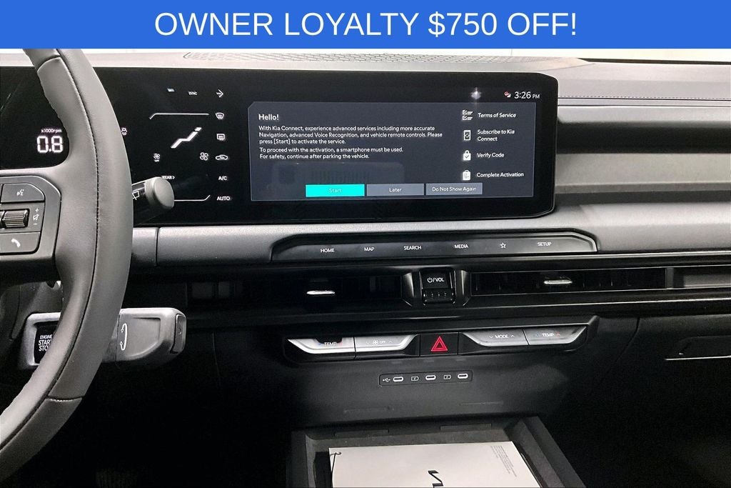 - Radio: AM/FM Display Audio System -inc: 12.3" center infotainment w/navigation, wireless Apple CarPlay and Android Auto, SiriusXM, Bluetooth® w/voice recognition, 8 SoundHound speakers, passenger talk, Wi-Fi hotspot, Kia Connect, Over-the-Air update capability and 1 data USB-C port in front row