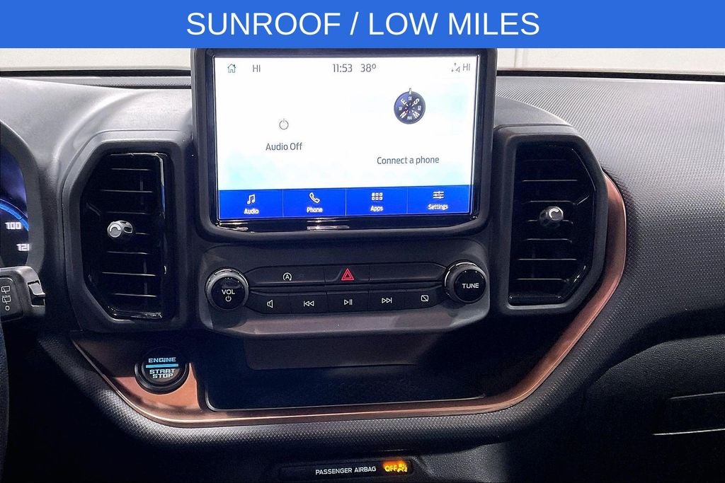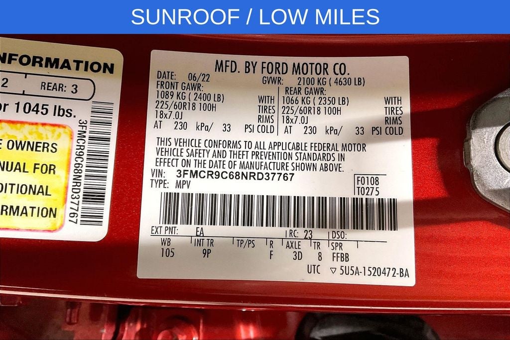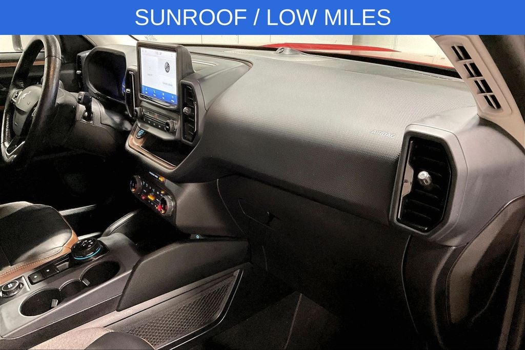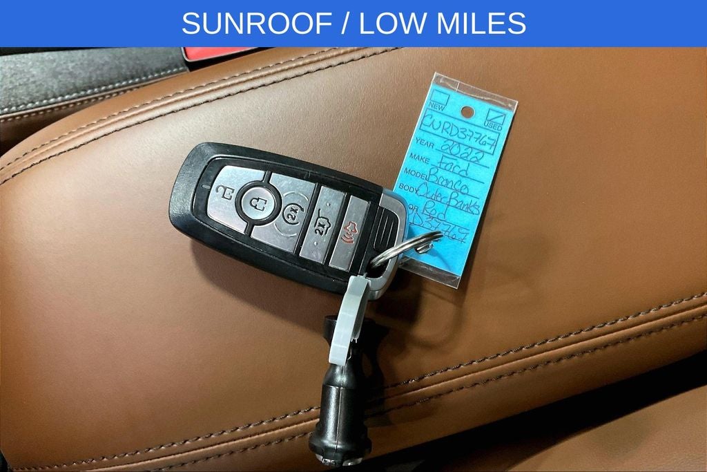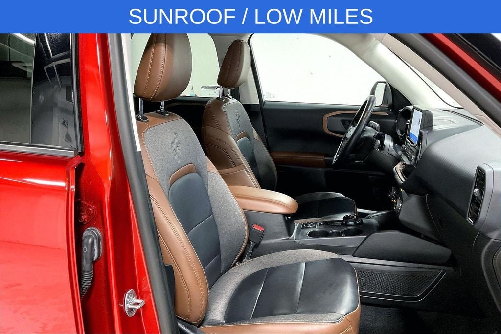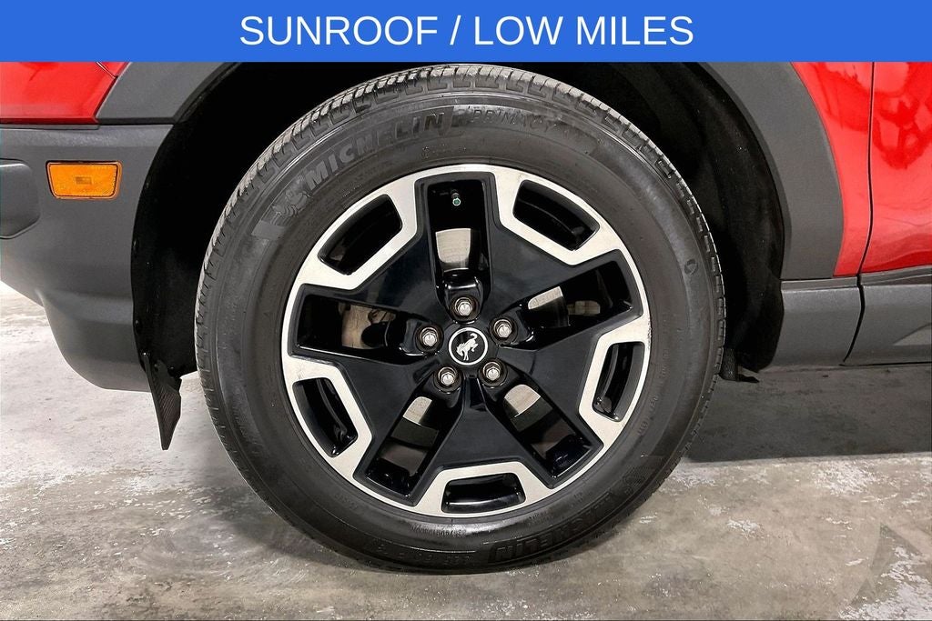 New Price! 2022 Ford Bronco Sport Outer Banks Outer Banks Hot Pepper Red Tinted Clearcoat 4D Sport Utility 4WD 1.5L EcoBoost 8-Speed Automatic 1 Owner, New Feature, Apple CarPlay / Android Auto, Backup camera, Blind Spot Monitoring, Bluetooth®, Remote Start, Bronco Sport Outer Banks, 4D Sport Utility, 1.5L EcoBoost, 8-Speed Automatic, 4WD, Hot Pepper Red Tinted Clearcoat, Ebony w/Cloth Front Bucket Seats, 3.80 Axle Ratio, 4-Wheel Disc Brakes, 6 Speakers, ABS brakes, Air Conditioning, Alloy wheels, AM/FM radio: SiriusXM, AM/FM Stereo, Auto High-beam Headlights, Auto-dimming Rear-View mirror, Automatic temperature control, Brake assist, Compass, Delay-off headlights, Driver door bin, Driver vanity mirror, Dual front impact airbags, Dual front side impact airbags, Electronic Stability Control, Emergency communication system: SYNC 3 911 Assist, Equipment Group 300A, Four wheel independent suspension, Front anti-roll bar, Front Bucket Seats, Front Center Armrest, Front dual zone A/C, Front fog lights, Front reading lights, Fully automatic headlights, HD Radio, Heated door mirrors, Heated front seats, Heated steering wheel, Illuminated entry, Knee airbag, Leather Trimmed Heated Sport Contour Bucket Seats, Low tire pressure warning, Occupant sensing airbag, Outside temperature display, Overhead airbag, Overhead console, Panic alarm, Passenger door bin, Passenger vanity mirror, Power door mirrors, Power driver seat, Power Moonroof, Power passenger seat, Power steering, Power windows, Radio data system, Rain sensing wipers, Rear anti-roll bar, Rear Parking Sensors, Rear reading lights, Rear seat center armrest, Rear window defroster, Rear window wiper, Remote keyless entry, Roof rack: rails only, Security system, SiriusXM Radio, Speed control, Speed-sensing steering, Speed-Sensitive Wipers, Split folding rear seat, Steering wheel mounted audio controls, SYNC 3 Communications & Entertainment System, SYNC 3/Apple CarPlay/Android Auto, Tachometer, Tech Package, Telescoping steering wheel, Tilt steering wheel, Traction control, Trip computer, Universal Garage Door Opener (UGDO), Variably intermittent wipers, Wheels: 18 Ebony Black-Painted Aluminum, Wireless Charging Pad.