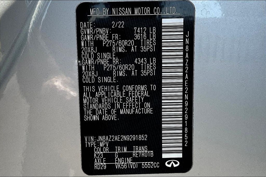 Experience luxury in motion with this 2022 INFINITI QX80 Luxe, a pre-owned masterpiece in shimmering Liquid Platinum with a refined Graphite interior. This 4WD SUV offers commanding presence and comfort, featuring an auto-leveling suspension, 20 alloy wheels, and a power moonroof to elevate every drive. Sink into heated seats with leather upholstery, enjoy a heated steering wheel, and revel in the 13-speaker Bose premium audio system. With a power liftgate, auto-dimming heated door mirrors, memory seat, and 3rd row seats, this QX80 Luxe is built for sophistication and space--test it out today!