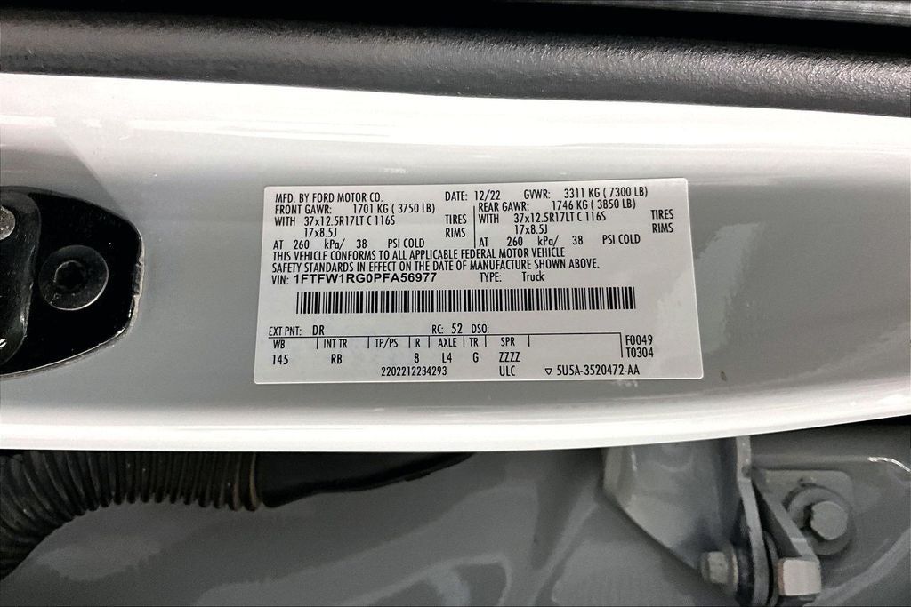 2023 Ford F-150 Raptor Raptor Avalanche Gray 4D SuperCrew 4WD 3.5L V6 EcoBoost 10-Speed Automatic F-150 Raptor, 4D SuperCrew, 3.5L V6 EcoBoost, 10-Speed Automatic, 4WD, Avalanche Gray, Black Leather, 18 Speakers, Air Conditioning, AM/FM radio: SiriusXM with 360L, Automatic temperature control, Equipment Group 801A Standard, Front dual zone A/C, GVWR: 7,300 lbs Payload Package, Memory seat, Moonroof & Tailgate, Navigation system: Connected Navigation, Pedal memory, Power driver seat, Power steering, Power Tailgate, Power windows, Pro Power Onboard - 2KW, Radio data system, Radio: B&O Unleashed Sound System by Bang & Olufsen, Raptor 37 Graphics, Raptor 37 Performance Package, Raptor Carbon Fiber Package, Rear window defroster, Remote keyless entry, Sport Tuned Shock Absorbers, SYNC 4 w/Enhanced Voice Recognition, Twin Panel Moonroof, Wheels: Unique 17 Forged Aluminum Bead-Lock Capable.