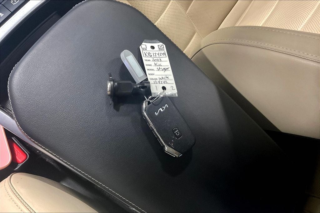 2023 Kia Stinger GT2 GT2 Snow White Pearl 4D Sedan AWD 3.3L V6 DGI 8-Speed Automatic Stinger GT2, 4D Sedan, 3.3L V6 DGI, 8-Speed Automatic, AWD, Snow White Pearl, Beige Leather, 15 Speakers, 4-Wheel Disc Brakes, ABS brakes, Adaptive suspension, Air Conditioning, Alloy wheels, AM/FM radio: SiriusXM, Anti-whiplash front head restraints, Apple CarPlay & Android Auto, Auto High-beam Headlights, Auto tilt-away steering wheel, Auto-dimming door mirrors, Auto-dimming Rear-View mirror, Automatic temperature control, Brake assist, Bumpers: body-color, Compass, Delay-off headlights, Driver door bin, Driver vanity mirror, Dual front impact airbags, Dual front side impact airbags, Electronic Stability Control, Emergency communication system, Four wheel independent suspension, Front anti-roll bar, Front Bucket Seats, Front Center Armrest, Front dual zone A/C, Front reading lights, Fully automatic headlights, Garage door transmitter: HomeLink, harman/kardon® Speakers, Heads-Up Display, Heated & Ventilated Front Bucket Seats, Heated door mirrors, Heated front seats, Heated rear seats, Heated steering wheel, Illuminated entry, Knee airbag, Low tire pressure warning, Memory seat, Nappa Leather Seat Trim, Navigation System, Occupant sensing airbag, Outside temperature display, Overhead airbag, Overhead console, Panic alarm, Passenger door bin, Passenger vanity mirror, Power door mirrors, Power driver seat, Power Liftgate, Power moonroof, Power passenger seat, Power steering, Power windows, Radio: harmon/kardon AM/FM/MP3/HD Audio System, Rain sensing wipers, Rear air conditioning, Rear anti-roll bar, Rear reading lights, Rear seat center armrest, Rear window defroster, Remote keyless entry, Security system, Smart Key w/ Push Button and Remote Start, Speed control, Speed-sensing steering, Speed-Sensitive Wipers, Split folding rear seat, Sport steering wheel, Steering wheel memory, Steering wheel mounted audio controls, Tachometer, Telescoping steering wheel, Tilt steering wheel, Traction control, Trip computer, Turn signal indicator mirrors, Variably intermittent wipers, Ventilated front seats, Wheels: 8.0J x 19 Front/8.5J x 19 Rear Spire Alloy.