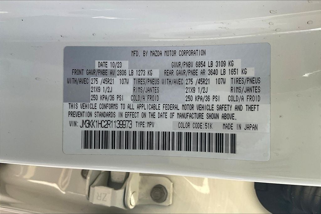 2024 Mazda CX-90 3.3 Turbo S 3.3 Turbo S Rhodium White Premium 4D Sport Utility AWD I6 Turbo 8-Speed Automatic 12 Speakers, Air Conditioning, Alloy wheels, AM/FM radio: SiriusXM, Auto High-beam Headlights, Auto-dimming Rear-View mirror, Automatic temperature control, Brake assist, Compass, Electronic Stability Control, Exterior Parking Camera Rear, Four wheel independent suspension, Front Bucket Seats, Front dual zone A/C, Heads-Up Display, Heated Front Bucket Seats, Heated front seats, Infotainment System Voice Command, Knee airbag, Leather Seat Trim, Mazda Navigation System, Memory seat, Navigation System, Navigation system: MAZDA CONNECT, Pandora Internet Radio Integration, Power driver seat, Power Liftgate, Power moonroof, Power passenger seat, Power steering, Power windows, Radio Broadcast Data System Program Information, Radio data system, Radio: AM/FM w/Bose Audio Sound System, Rear air conditioning, Rear window defroster, Remote keyless entry, Speed-sensing steering, Steering wheel mounted audio controls, Tachometer, Traction control, Wheels: 21 x 9.5J Aluminum Alloy.